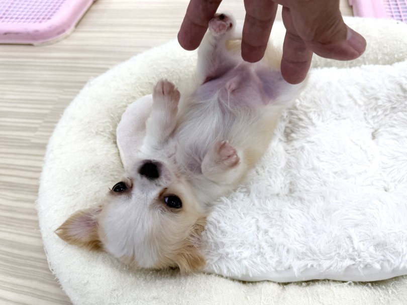 このお腹を見せてくれいる様子から、周囲への信頼やリラックスした気持ちが伝わってきます。チワワちゃんの男の子は、飼い主様には明るく人懐こい性格と言われています。