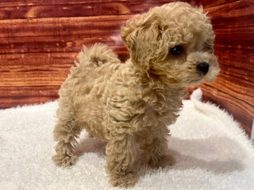 まん丸の瞳と短めのマズルが作り出すベビーフェイスは見ているだけで自然と笑顔になります。毛質はマルチーズ由来の柔らかさとトイプードル由来の緩やかなカールが合わさったボリュームたっぷりの被毛。