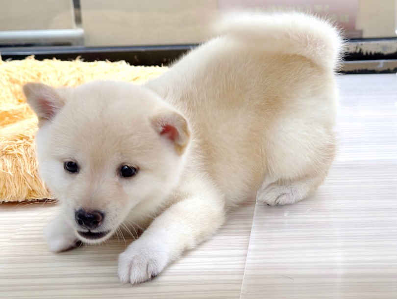 豆柴の中でも白毛は非常に数が少なく、店舗でも数年に一度出会えるかどうかという希少カラー。