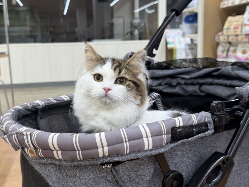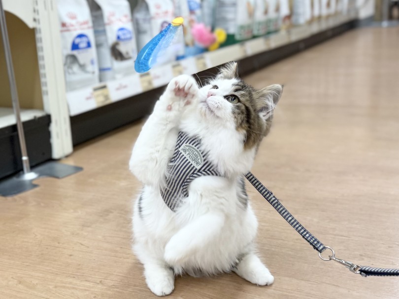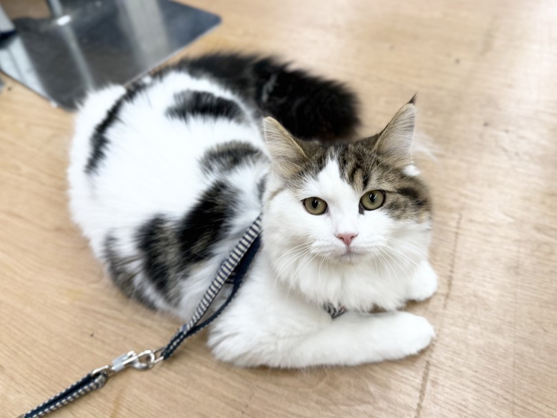 ※本来ねこちゃんにお散歩は必要ありませんが、人馴れや音馴れなどの為にワクチンプログラムが終わった子は、安全の為ハーネスをつけて店内散歩しています。