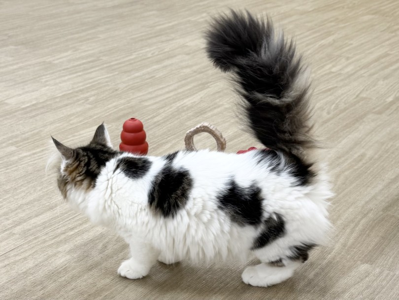 ワクチンプログラムが終わる頃には装着に馴れており、ハーネスを見せると『お部屋の外で遊べる』と認識して、遊んでる途中でもスタスタ寄ってくる様になりました。