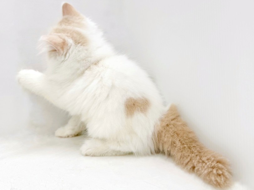 全身は、雪のように真っ白なホワイトカラーで、頭部と尻尾に濃いめのクリームカラーが入っています。