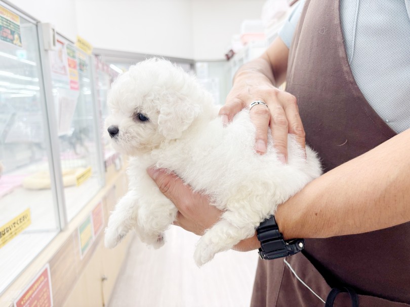 前足の肩口と両足の付け根をしっかり抑えて保定させる子犬育成の基本中の基本である「魔法の抱っこ」を入店のときから毎日練習した甲斐あって、非常に安定感のある抱っこをさせてくれるようになりました(^^)