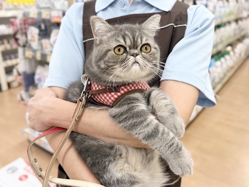ワクチンが終わってからはハーネスを着けて、在籍中の猫ちゃん達と一緒に店内散歩。ハーネスを装着する事で、通院時や災害時など、キャリーケースから猫が飛び出してしまう危険を防ぐのに役立ちます。
