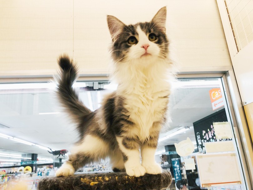 生後2ヵ月の入店当初に比べて、ブルータビー&ホワイトカラーの上品な被毛が、さらに美しく、性格は慎重さの中に確かな甘えと信頼が育ち、遊びや生活リズムにも、お姉さんらしさがみえてきました。
