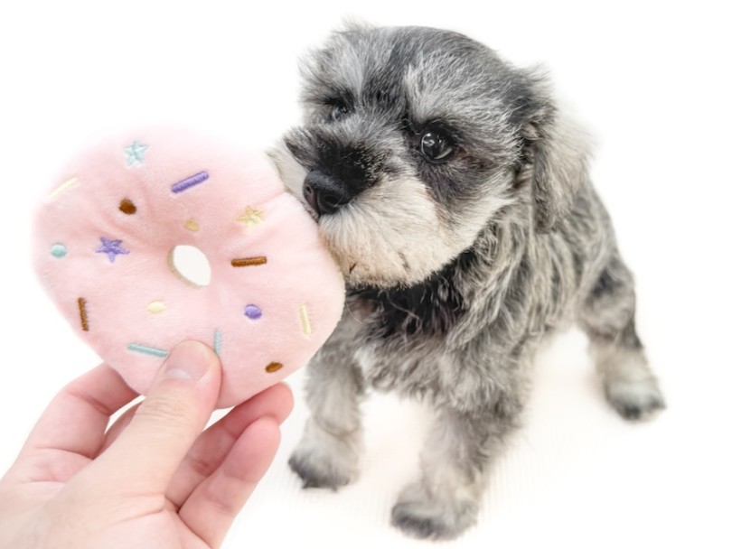 ドーナツのおもちゃに夢中になるシュナちゃん。遊び好きで明るい性格はシュナウザーそのもの!ですが、進みすぎることはなく、ところどころにマイペースでおっとりした仕草が混ざるのがこの子の魅力♪
