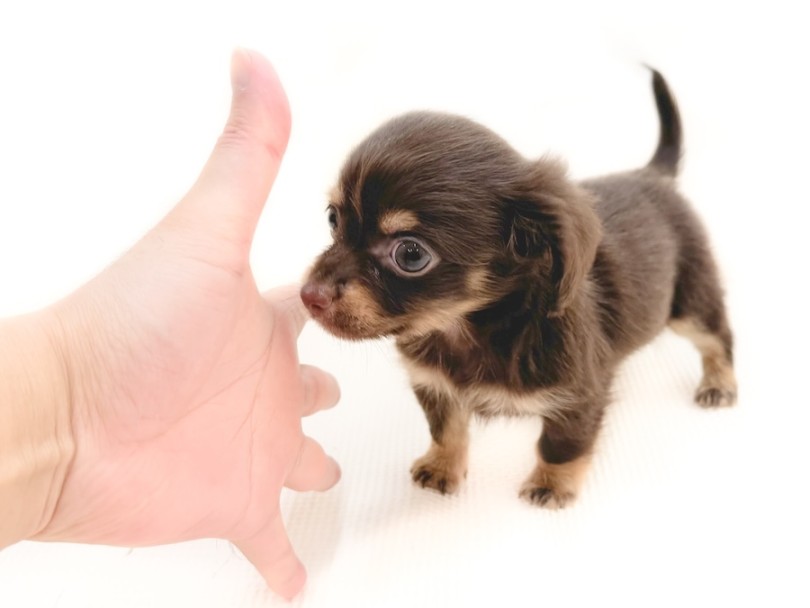 下丸子店恒例のスタッフの手との背比べ!チワワ譲りのコンパクトなサイズ感がよく分かりますよね~。