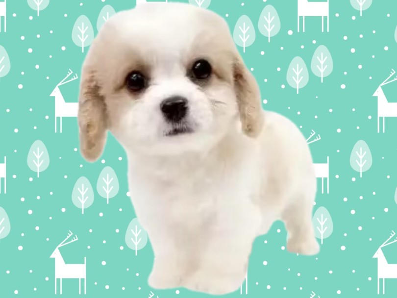 ブレンハイムカラーはキャバリアの伝統的な配色で、クラシカルな印象を演出。そこにビション譲りの軽さのある被毛が加わることで、シルエットがふんわり見え、動くたびに柔らかく揺れるのが魅力。