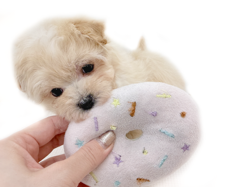 おもちゃのドーナツをぱくりっっ!好奇心旺盛なマルプーちゃんは、興味があるおもちゃを見つけると全力で遊びます。