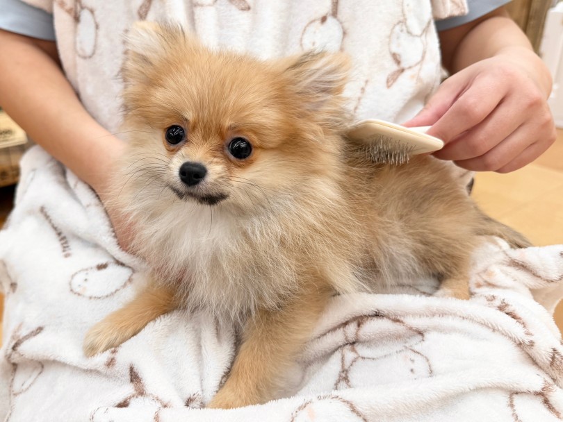 ブラッシングしてくれるんですかー?とスタッフを見つめた後はお膝で落ち着いて何でもされるがままのポメちゃん。お家に行ってもお手入れがこんなに楽にできたら嬉しいですよね♪