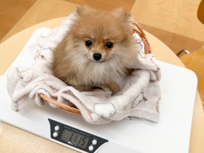 体重測定してみたら、なんと1.1kg!!この月齢でこの体重!本当に小さいんですよ。過去No.1と言っても過言ではない程、この月齢にしては小さなポメラニアンちゃんです。