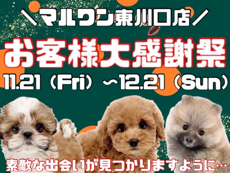 11/21よりスタートしました『お客様大感謝祭』早くもご好評頂いており、たくさんのワンちゃんが素敵なご家族様との出会いを果たしております。