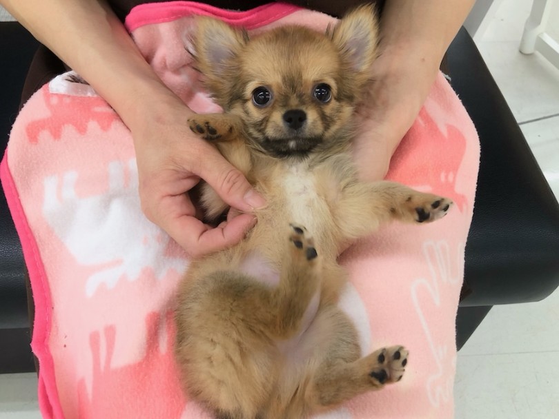 ▲警戒心のかけらもないチワワちゃま。お腹を出してのマッサージでもされるがまま♡