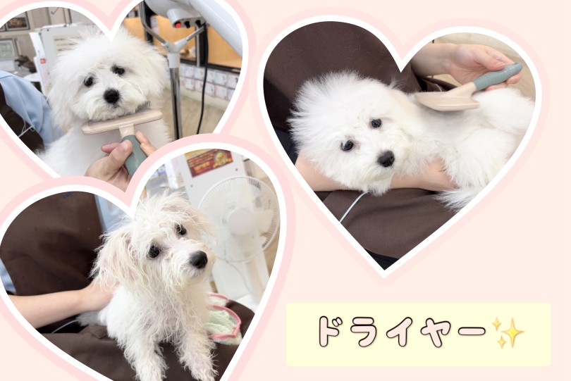 シャンプーを終えて、お次はドライヤー&ブラッシングタイム♪膝の上にちょこんと座ったビションちゃんは、すっかりリラックスモードです。