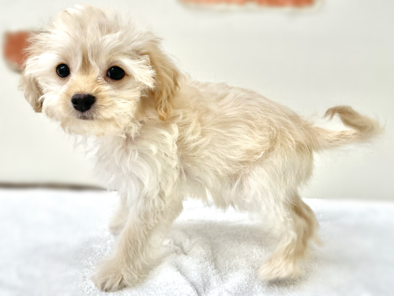 指先を滑らせたくなるようなやわらかに波打つウェーブの被毛はトイプー譲りで、ふんわりと空気をまとったような軽やかさがあります。