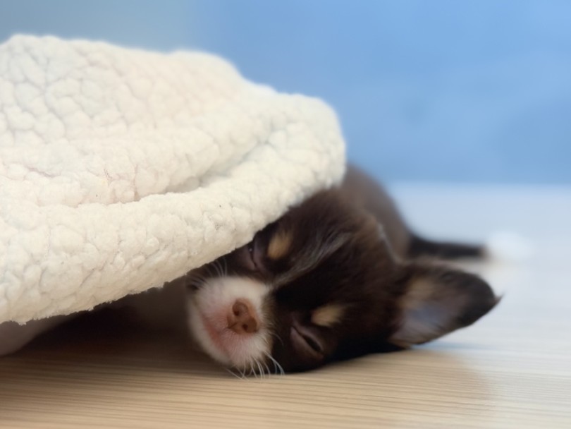 ▲ブランケットを自分で上手にお布団のように被るチョコチーちゃま(笑)現在チワワちゃま専用のお部屋(90×60サイズ)でのお留守番トレーニングも実施しております。