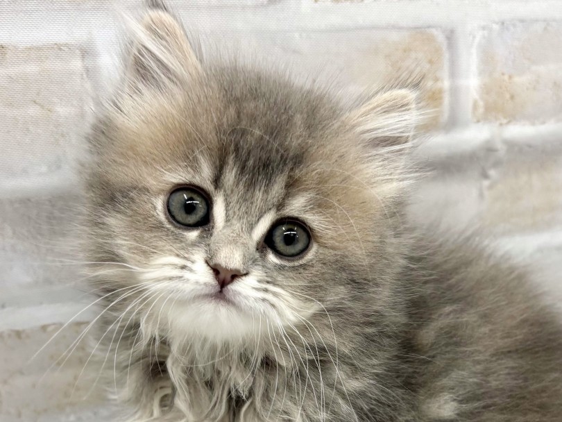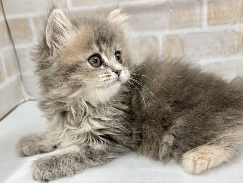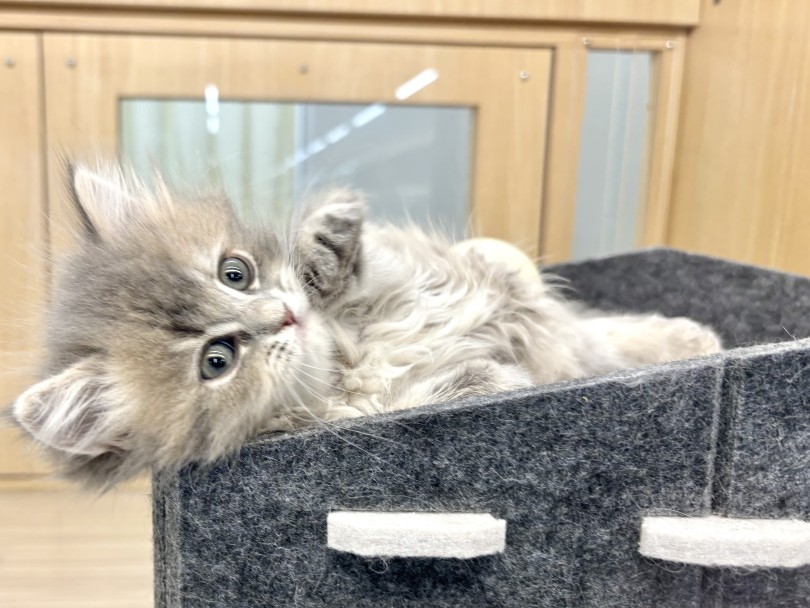 この子の魅力は、まるで雲をそっとまとったような軽やかさと柔らかさのある被毛です!淡いブルーグレーのカラーに、さりげなく浮かぶタビー模様が上品な陰影をつくり子猫らしい透明感をいっそう引き立てています。