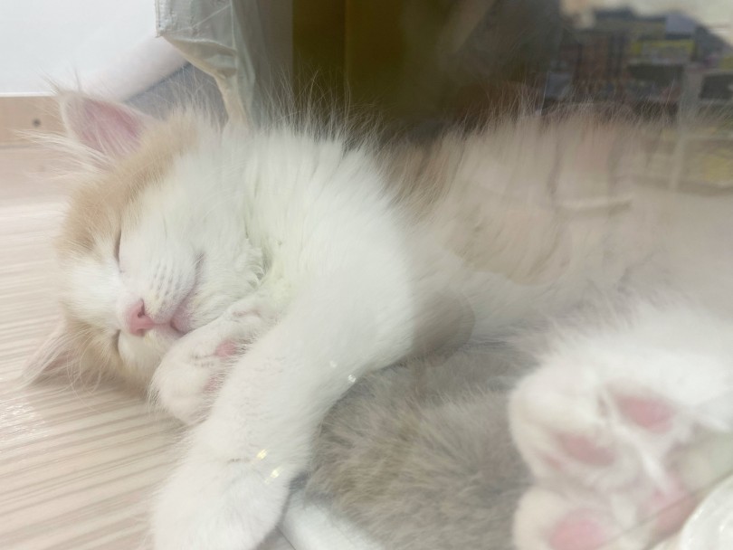 この子の被毛の色はクリームタビー&ホワイトになります。やわらかなクリーム色にうっすらとタビー模様(縞模様)+ホワイトカラーです。