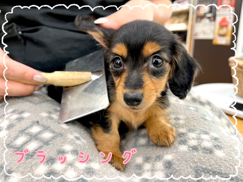 ロングコートのダックスちゃんなので、毛玉・毛もつれ予防の為にも1日1回はブラッシングしてあげて下さい!写真ではスリッカーブラシを使用してますが、子犬の間は毛も短いのでコームブラシでも良いと思います!