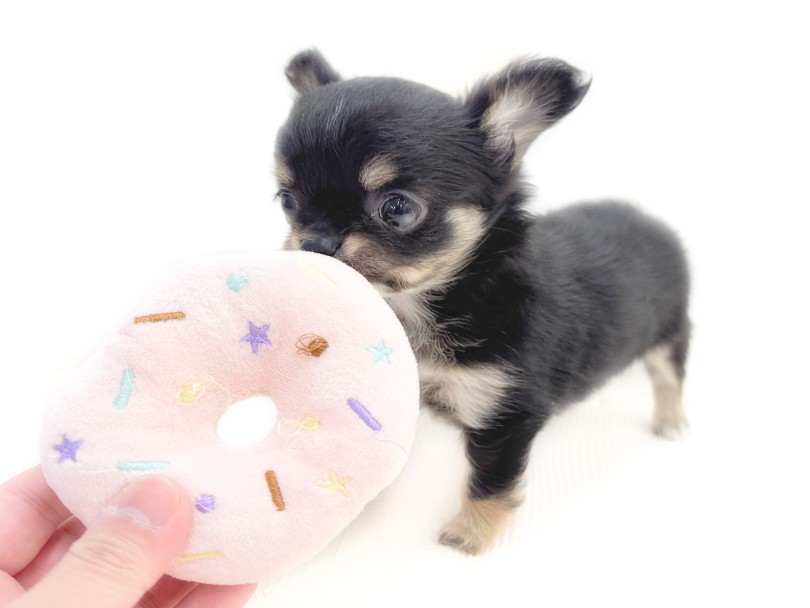 お顔の2倍はあるドーナツのおもちゃに興味津々!このおもちゃも小さいのですが、チワワちゃんのお顔の方がはるかに小さい…。