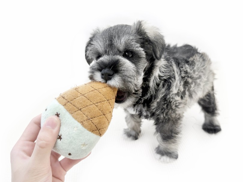 落ち着いた性格のなかにも、シュナウザーらしい遊び好きな一面がチラリ(*´▽`*)おもちゃの楽しさを知ると、そっと加えて楽しそうな姿を見せてくれました♪