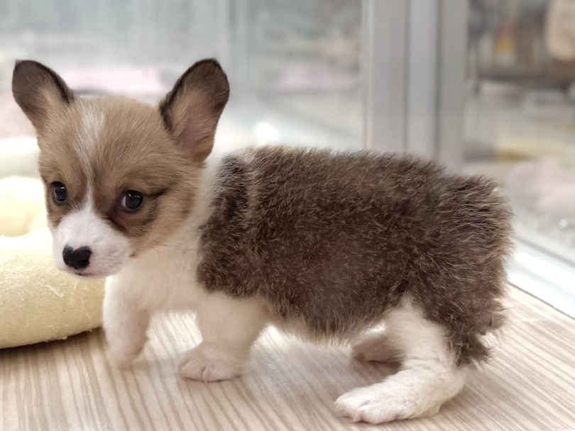 セーブル&ホワイトの毛色はレッドよりも少し奥行きのある色合いで、毛先に向かって濃淡がにじむのが特徴です。背中からお尻にかけては深いブラウンが強く、肩や首回りには柔らかいクリームが混ざることで子犬らしいふわっとした印象に見えます。