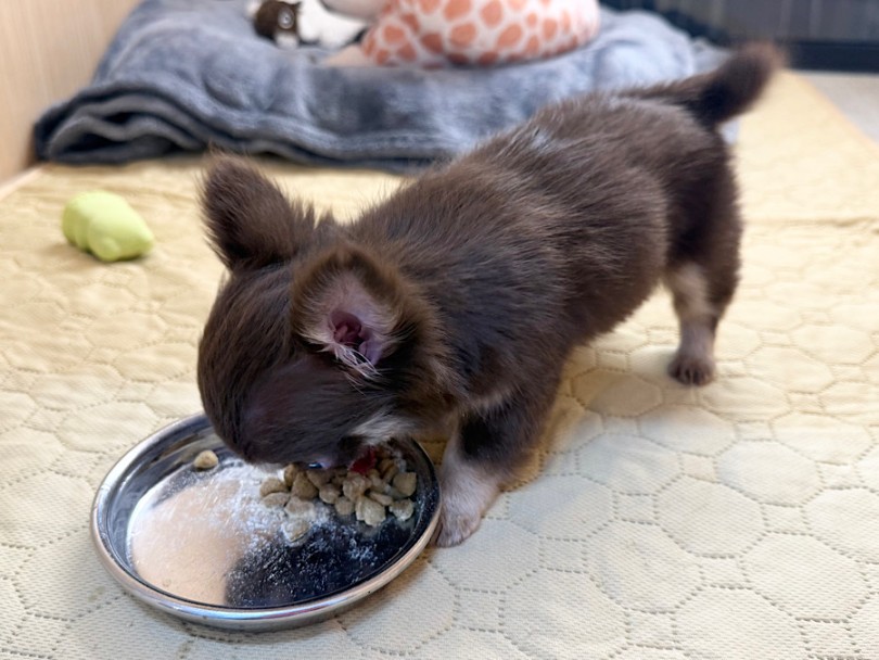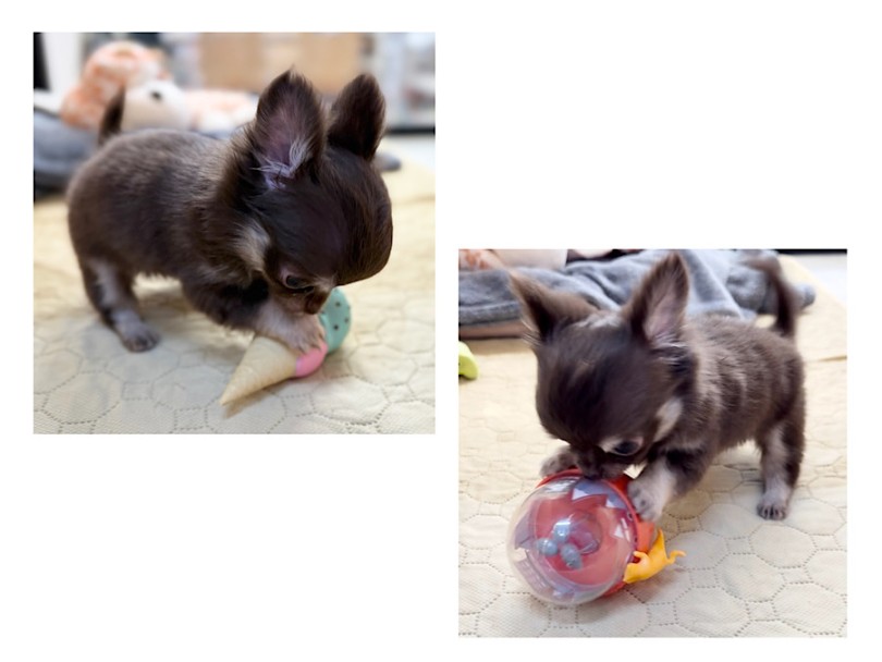 元気いっぱい人懐こい性格のチワワちゃん。入店初日、犬舎に入ってすぐに用意していたオモチャで全く緊張もせず1人遊びを始めました。