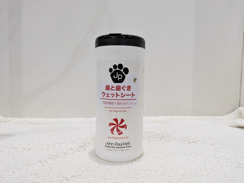 ここまで当店のデンタルについてご紹介してきましたが、そんなケア時に使用しているのが「ジョンポールペット」という物になります。大きめのシートタイプになっており、歯全体むらなく磨きあげ、爽やかなミントの香りがお口の臭いを軽減させてくれます。柔らか素材で歯が弱くなってきた子でも安心して使用可能です。
