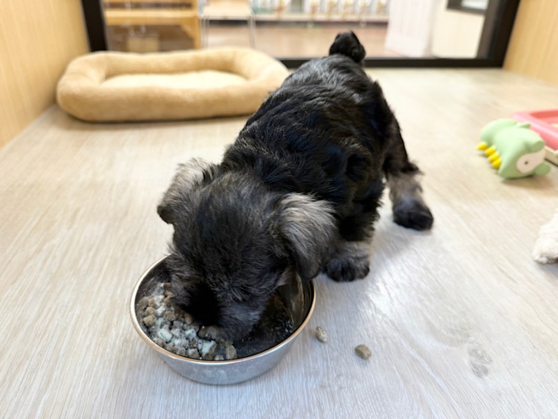 ご飯は現在、シュプレモの子犬用をふやかして粉ミルクをふりかけて食べています。