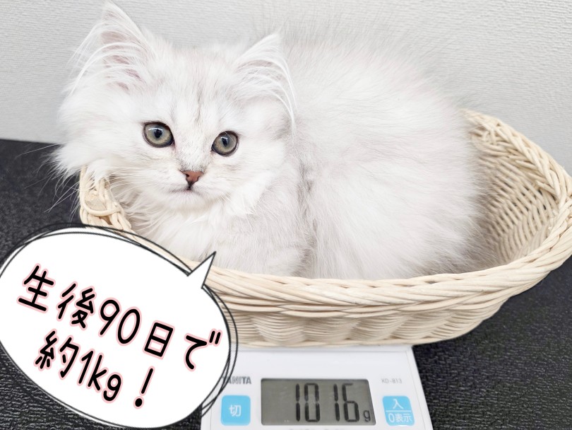 生後90日の体重は約1kg!パパが4.5kg、ママが3kgなのでペルちゃんも4kg前後でおさまりそうな予感が致しますよ。