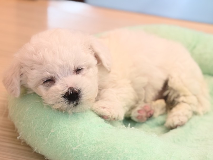 △ベッドの縁に顎のせしてスヤスヤ。。天使の寝顔♡なんとも安心しきったこちらの寝顔からもお分かりいただけるかと思いますが、警戒心皆無のビションちゃまです♪