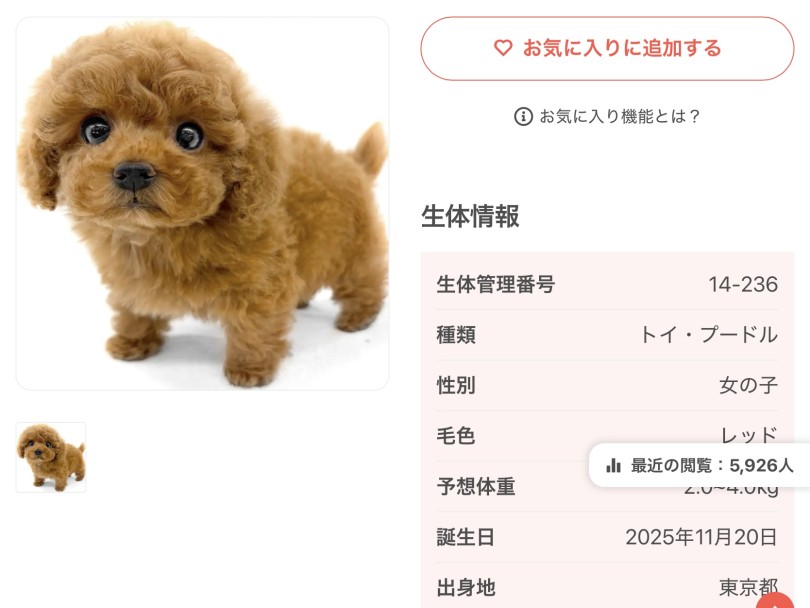いかがでしたでしょうか?入店後1日で1916人の方に閲覧いただき、その後は1日ごとに1000人以上のペースで注目されているトイプーちゃん!(ご家族決まった際は6000人近くの方に見てもらってました)