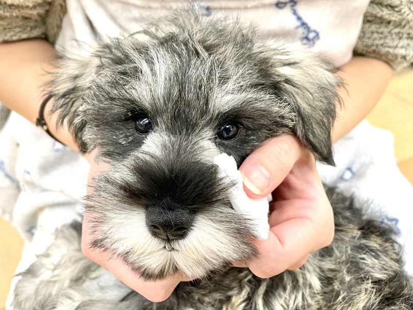 本日ご紹介するのは、生後3ヶ月を迎え心も体も美しく育ってきたミニチュアシュナウザーの女の子。今では元気いっぱいにおもちゃを咥えて、人の手のぬくもりに安心して身を委ねてくれるように!