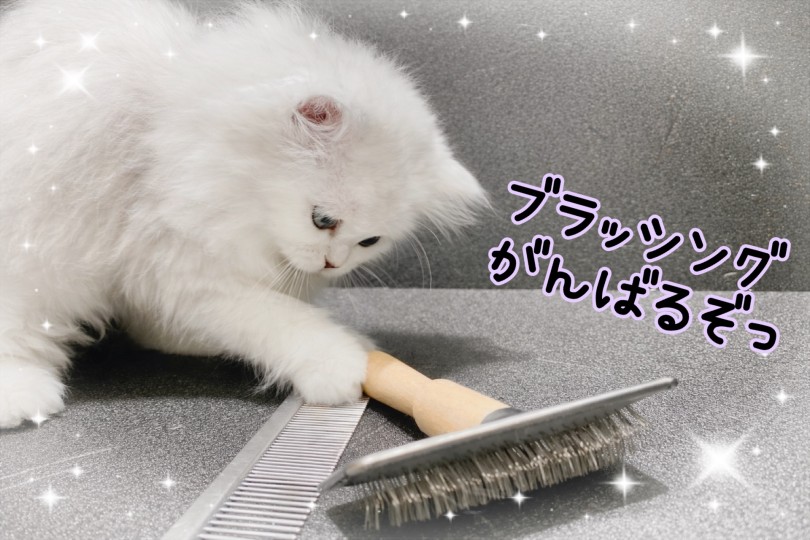 長毛種のペルちゃんは、毎日の軽いブラッシングがおすすめです。絡まりやすい首元や脇、内ももを優しくケアしてあげることで毛玉防止になります。