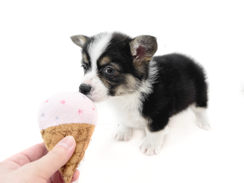 むっちり丸い短足胴長ボディにぷりぷりのお尻、そしてブラックタン&ホワイトのレアカラーが映える『カッコ可愛い』魅力もばっちりのこの子!