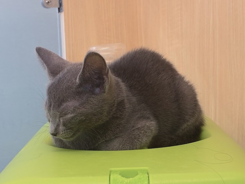 ▲お気に入りアイテムのキャリーケースの上で溝に収まりお昼寝中♪初めての環境にも動じることなく元気いっぱいなロシアンブルーちゃま。