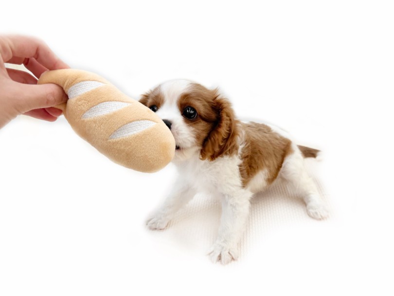 パンのおもちゃに手をかけてじっと見つめる姿からも伝わる、初日とは思えないほどの適応力。初めましての瞬間からフレンドリーで、キャバリアらしいコミュニケーション能力の高さと懐っこさを早くも発揮。