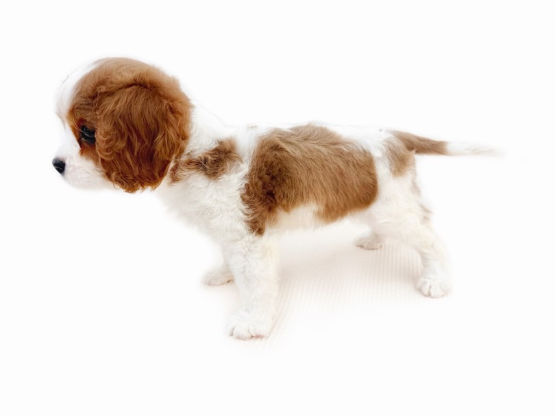 横から見ると、キャバリアにのみ認められているブレンハイムの美しい配色がより際立ち、気品も持ち合わせている点もキャバリアちゃんの魅力。このカラーは一頭一頭表情が違い、世界にひとつだけの特別な模様になるのも個性が光る嬉しいポイント♡