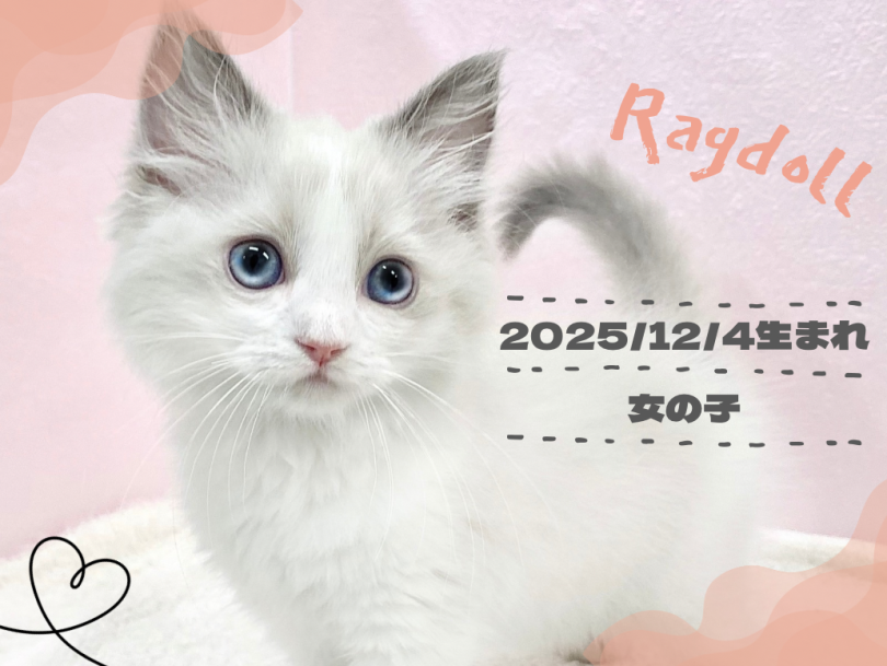 純白のボディにやさしく色づくブルーのポイントカラーは、ラグドールの中でも特に人気の高い配色。
