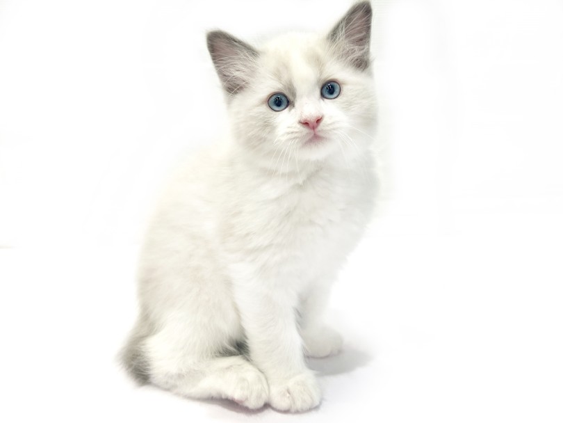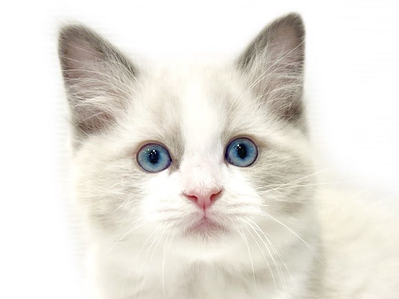 ふわふわの被毛に澄んだブルーの瞳、そしてクリスマスが誕生日のブルーポイントバイカラーのラグドールの男の子。