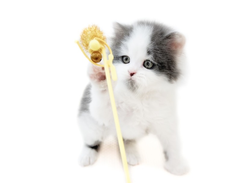 猫じゃらしをしっかり見つめ、前足を伸ばして可愛い猫パンチ!