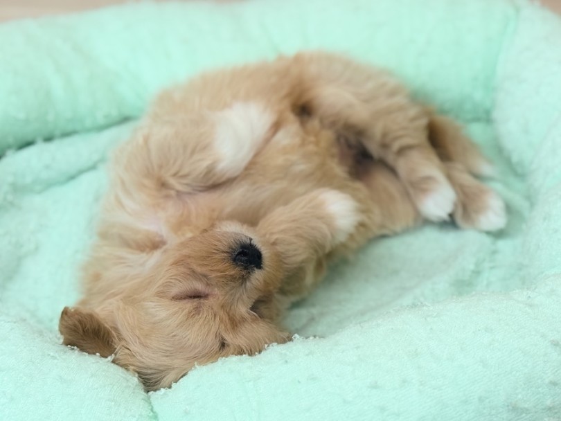 指が埋もれるほど毛量も多く、ゆるやかなウェーブがかった被毛は極上の触り心地♪両親共にシングルコートなので、抜け毛や体臭が少なめなのも人気の理由の一つなのです!