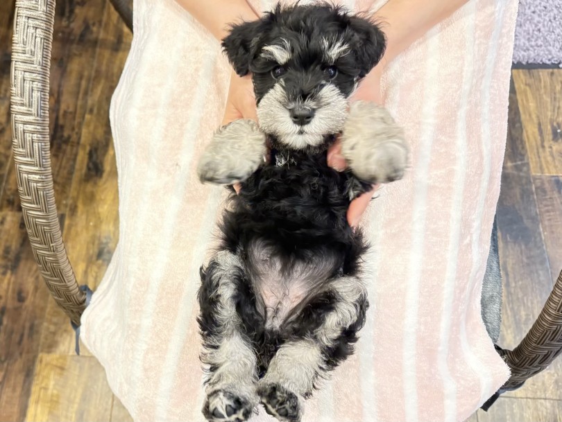 将来、眉や口ひげが伸びてくると、この黒銀のコントラストがさらに際立ちシュナカットがとても映える子に育ちます。