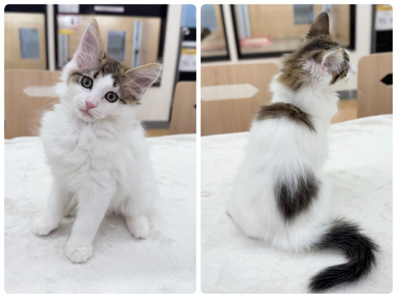 ボディはホワイトがベースで、尻尾や背中、オデコから後頭部にかけてブラウンが入っています。
