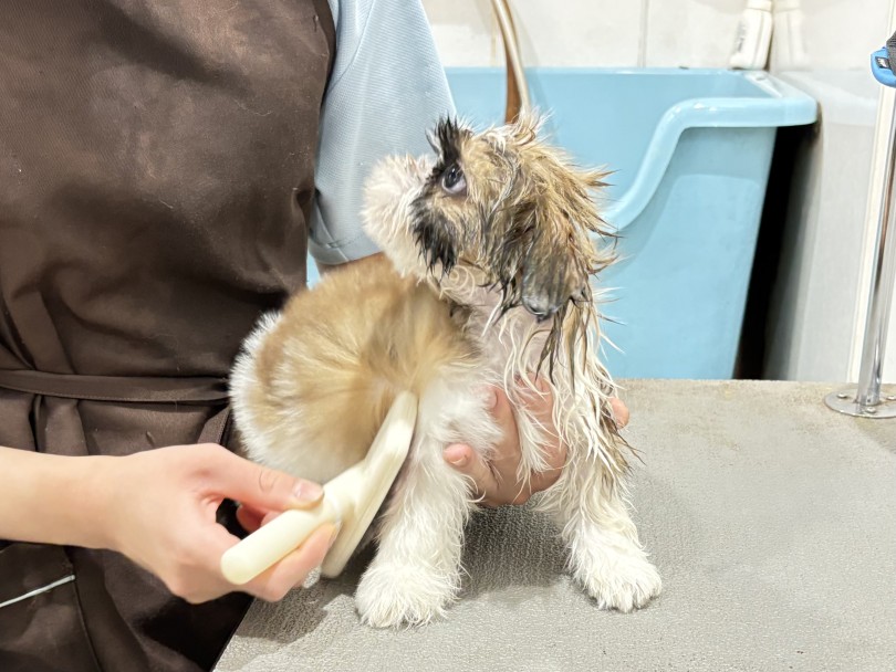 ドライヤーの音に「ん?」と驚いた表情を見せたものの、スタッフの声かけやアイコンタクトで安心してくれたんです♪好奇心もあるけれど、ちゃんと人を頼ってくれる——
