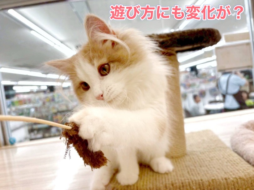 遊んでいる間は、表情や動きに子猫らしい元気さがしっかり出ていて、おもちゃへの興味がはっきり感じられる遊び方です。