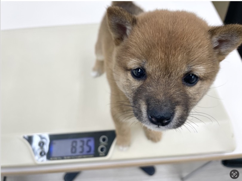 父(黒、6.0kg)、母(赤、5.5kg)で入店時の体重は(2026年3月31日計測時・835g)でした。両親の体重からも将来的には5kg前後位を予測しておりますので、室内飼育もしやすい日本犬をお探しの方に向いた体格です。