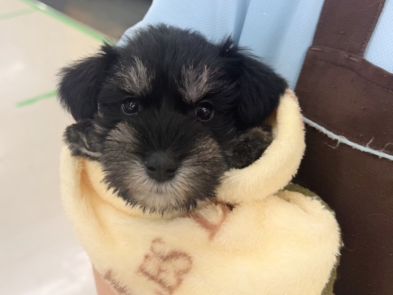 今宿のシュナちゃまは、キュるんとしたまんまるの瞳にシルバーの眉毛とまあるい口ひげでパピーらしさ全開の愛らしいお顔♡
