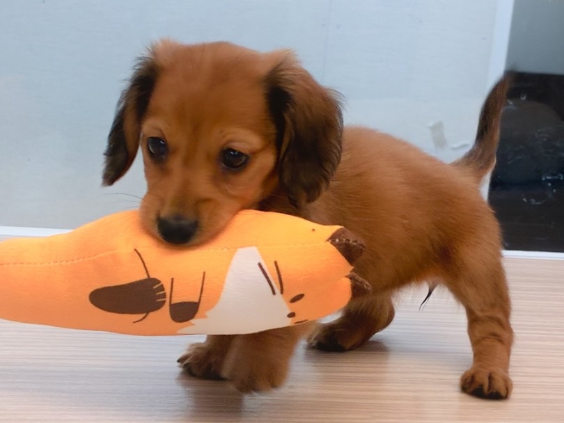 入店初日から元気いっぱいなダックスちゃま。自分の大きさと変わらないおもちゃで一生懸命遊び、1日3回のご飯もぺろりと完食!