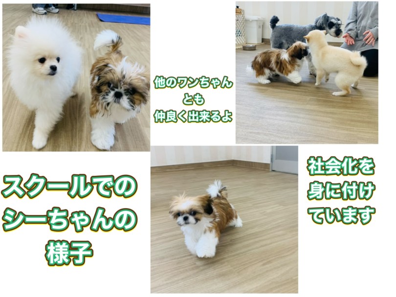 シーちゃんは、生後4ヶ月半を迎えて、できることが増えてきており、お店での練習やスクールでの経験を通して日常生活に必要な基礎が少しずつ身についてきています。